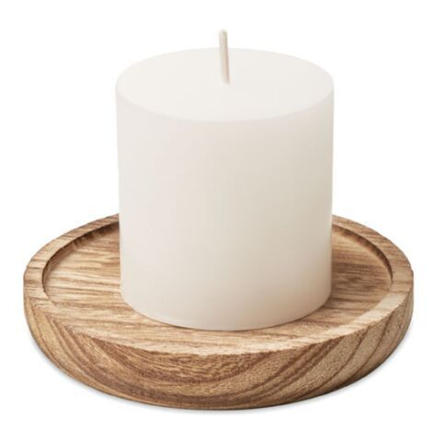 Round shaped wooden decorative base with vanilla fragranced candle.