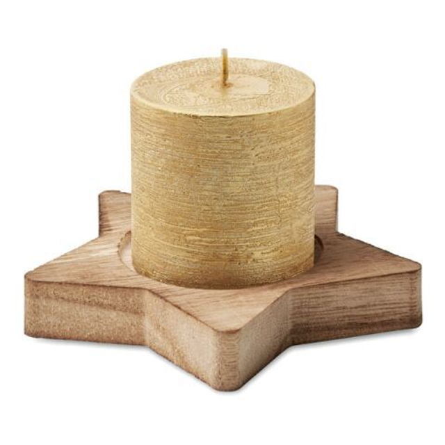 Star shaped wooden decorative base with vanilla fragranced candle.