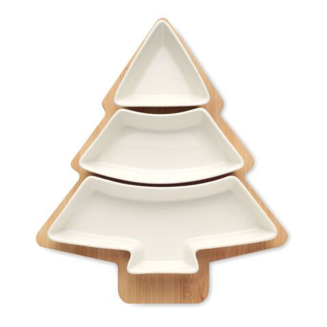Tree-shaped bamboo serving platter with three ceramic serving dishes. Bamboo is a natural product, there may be slight variations in colour and size per item, which can affect the final decoration outcome.