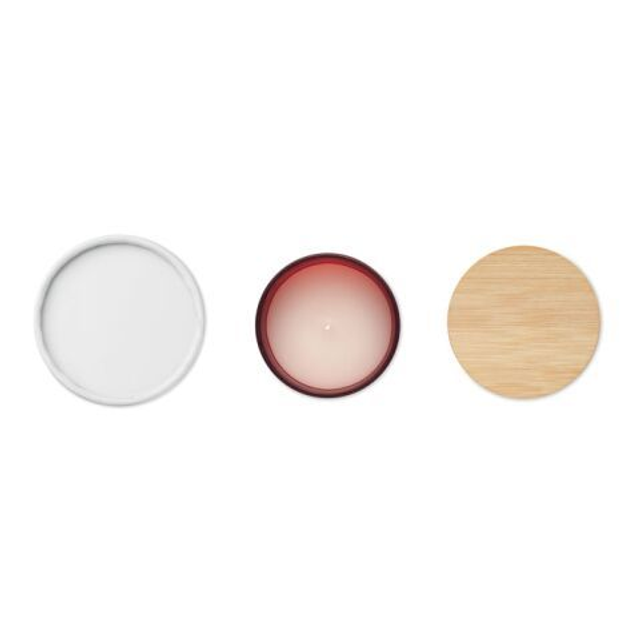 Fragranced plant based wax candle in frosted glass jar holder with bamboo lid. 120 gr. Burn time: 20 hours. Presented in a paper tube gift box.